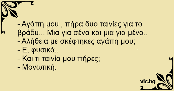 - Αγάπη μου , πήρα δυο ταινίες για το βράδυ... Mια για σένα και μια για μένα..