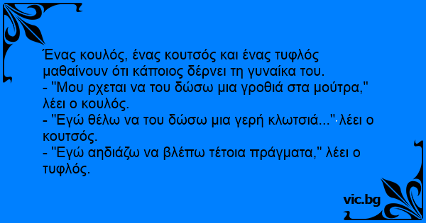 Ένας κουλός, ένας κουτσός και ένας τυφλός μαθαίνουν ότι κάποιος δέρνει τη γυναίκα του.