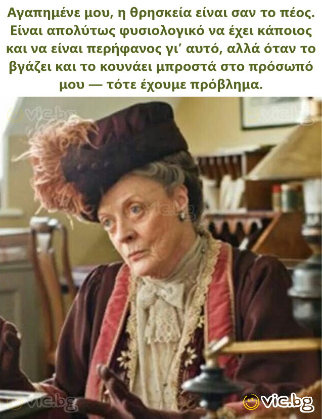 Скъпи мой, религията е като пeниc. Напълно нормално е човек да има такъв и дори да се гордее с него, но когато го извади и започне да ми го размахва пред лицето — тогава вече имаме проблем.