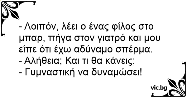 - Λοιπόν, λέει ο ένας φίλος στο μπαρ, πήγα στον γιατρό και μου είπε ότι έχω αδύναμο σπέρμα.