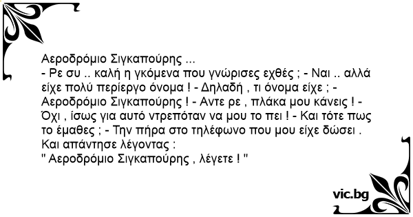 - Ρε συ .. καλή η γκόμενα που γνώρισες εχθές ; - Ναι .. αλλά είχε πολύ περίεργο όνομα ! - Δηλαδή , τι όνομα είχε ; - Αεροδρόμιο Σιγκαπούρης ! - Aντε ρε , πλάκα μου κάνεις ! - Όχι , ίσως για αυτό ντρεπόταν να μου το πει ! - Και τότε πως το έμαθες ; - Την πήρα στο τηλέφωνο που μου είχε δώσει . Και απάντησε λέγοντας :
