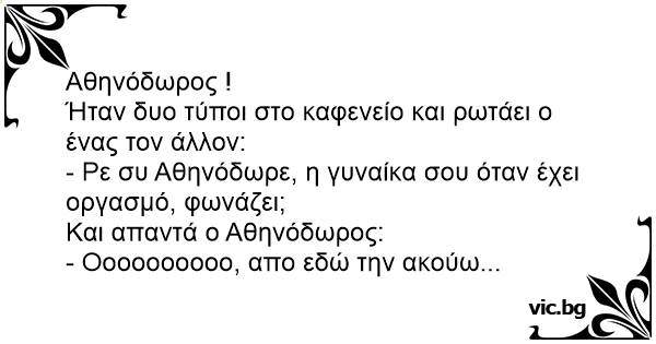 - Ρε συ Αθηνόδωρε, η γυναίκα σου όταν έχει οργασμό, φωνάζει;
