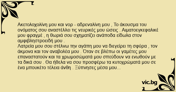 Η παρουσία σου ανακατώνει τις βιοχημικές μου δραστηριότητες . Ξέρεις όταν σε φέρνω στο μυαλό μου κάτι με σπρώχνει να πολυμερίσω τις τουμπουλίνες σου . Να φωτολύσω μέχρι θανάτου .