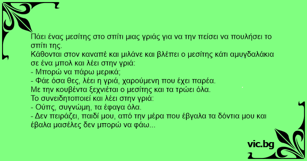 Κάθονται στον καναπέ και μιλάνε και βλέπει ο μεσίτης κάτι αμυγδαλάκια σε ένα μπολ και λέει στην γριά: