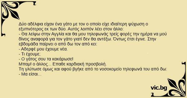 Δύο αδέλφια είχαν ένα γάτο με τον ο οποίο είχε ιδιαίτερη ψύχωση ο εξυπνότερος εκ των δύο. Αυτός λοιπόν λέει στον άλλο: