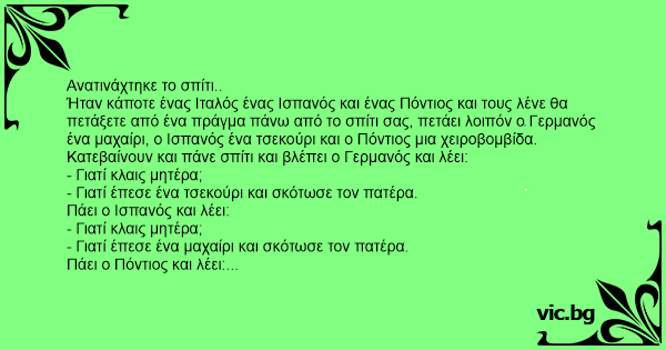 Ήταν κάποτε ένας Ιταλός ένας Ισπανός και ένας Πόντιος και τους λένε θα πετάξετε από ένα πράγμα πάνω από το σπίτι σας, πετάει λοιπόν ο Γερμανός ένα μαχαίρι, ο Ισπανός ένα τσεκούρι και ο Πόντιος μια χειροβομβίδα. Κατεβαίνουν και πάνε σπίτι και βλέπει ο Γερμανός και λέει: