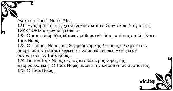 124. Για τον Τσακ Νόρις δεν ισχυει ο δευτερος νομος της Θερμοδυναμικής. O Τσακ Νόρις μειωνει την εντροπια του συμπαντος.