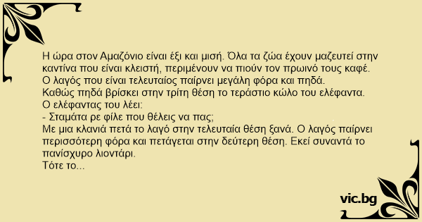 - Ωραίο μεζεδάκι είσαι. Που πας; Ολόκληρος βασιλιάς των ζώων και περιμένω στην δεύτερη θέση ακόμη.