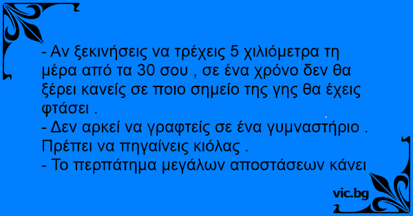 - Αν ξεκινήσεις να τρέχεις 5 χιλιόμετρα τη μέρα από τα 30 σου , σε ένα χρόνο δεν θα ξέρει κανείς σε ποιο σημείο της γης θα έχεις φτάσει . - Δεν αρκεί να γραφτείς σε ένα γυμναστήριο . Πρέπει να πηγαίνεις κιόλας . - Το περπάτημα μεγάλων αποστάσεων κάνει