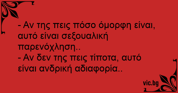 - Αν της πεις πόσο όμορφη είναι, αυτό είναι σεξουαλική παρενόχληση..<br />- Αν δεν της πεις τίποτα, αυτό είναι ανδρική αδιαφορία..