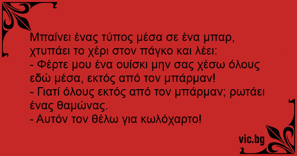 Μπαίνει ένας τύπος μέσα σε ένα μπαρ, χτυπάει το χέρι στον πάγκο και λέει: