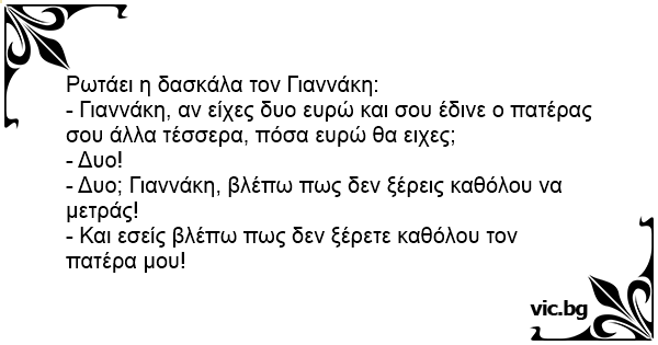 - Γιαννάκη, αν είχες δυο ευρώ και σου έδινε ο πατέρας σου άλλα τέσσερα, πόσα ευρώ θα ειχες;