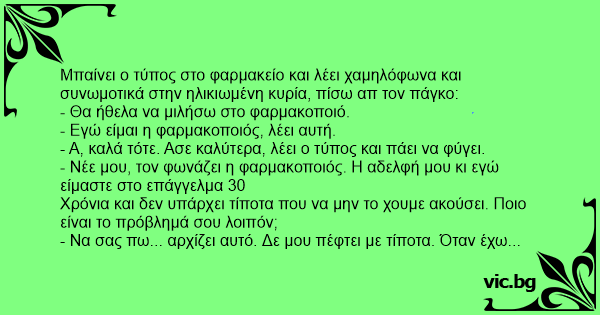 - Νέε μου, τον φωνάζει η φαρμακοποιός. Η αδελφή μου κι εγώ είμαστε στο επάγγελμα 30