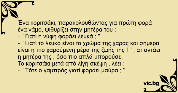 Мамо, ги гледав сликите од вашата свадба со тато и сакам да те прашам зошто носиш бел фустан? Мајката: Зошто белата боја е боја на радоста. Детето: А тогаш зошто тато е во црно?!