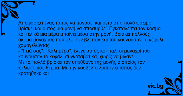 - "Α, ναι. Λοιπόν τέκνον μου, στην μονή μας πιστεύουμε ότι η πραγματική γαλήνη έρχεται με την απόλυτη σιωπή. Να ξέρεις λοιπόν ότι εδώ πέρα αφού αποφάσισες να μονάσεις σου επιτρέπονται μόνο 3 λέξεις κάθε 5 χρόνια. Είσαι έτοιμος να δεχθείς αυτήν την δοκιμασία;"