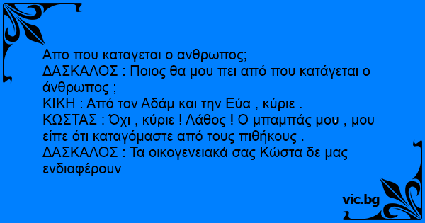 ΚΩΣΤΑΣ : Όχι , κύριε ! Λάθος ! Ο μπαμπάς μου , μου είπε ότι καταγόμαστε από τους πιθήκους .