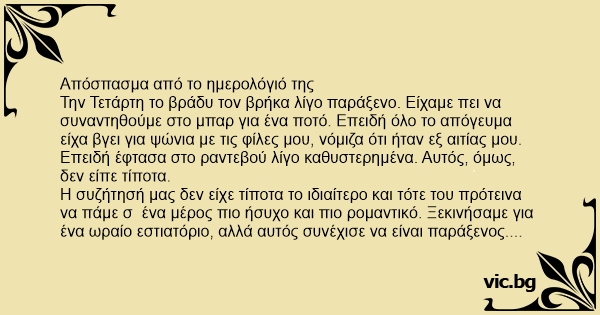 Η συζήτησή μας δεν είχε τίποτα το ιδιαίτερο και τότε του πρότεινα να πάμε σ ένα μέρος πιο ήσυχο και πιο ρομαντικό. Ξεκινήσαμε για ένα ωραίο εστιατόριο, αλλά αυτός συνέχισε να είναι παράξενος. Έδειχνε να είναι απών. Προσπάθησα να τον διασκεδάσω χωρίς αποτέλεσμα. Αναρωτιόμουν επίμονα αν ήταν δικό μου το φταίξιμο. Τον ρώτησα αν ήταν εξ αιτίας μου και μου απάντησε πως εγώ δεν είχα να κάνω, αλλά δεν πείστηκα.