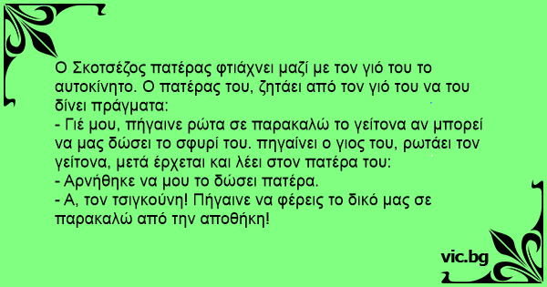 - Γιέ μου, πήγαινε ρώτα σε παρακαλώ το γείτονα αν μπορεί να μας δώσει το σφυρί του. πηγαίνει ο γιος του, ρωτάει τον γείτονα, μετά έρχεται και λέει στον πατέρα του: