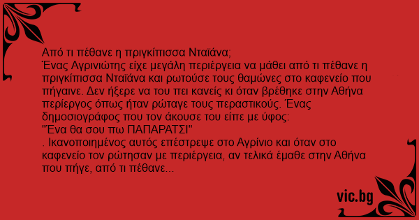 . Ικανοποιημένος αυτός επέστρεψε στο Αγρίνιο και όταν στο καφενείο τον ρώτησαν με περιέργεια, αν τελικά έμαθε στην Αθήνα που πήγε, από τι πέθανε η πριγκίπισσα Νταϊάνα, αυτός με ύφος τους απάντησε: