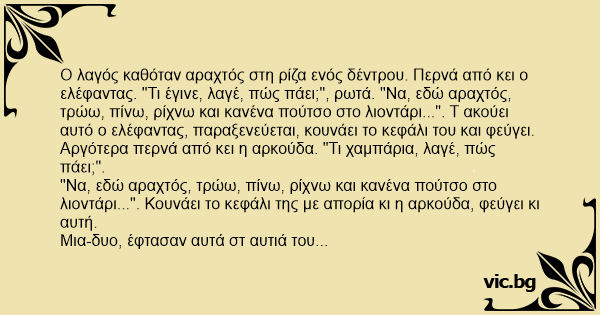 Ο λαγός καθόταν αραχτός στη ρίζα ενός δέντρου. Περνά από κει ο ελέφαντας. "Τι έγινε, λαγέ, πώς πάει;", ρωτά. "Να, εδώ αραχτός, τρώω, πίνω, ρίχνω και κανένα πούτσο στο λιοντάρι...". Τ ακούει αυτό ο ελέφαντας, παραξενεύεται, κουνάει το κεφάλι του και φεύγει. Αργότερα περνά από κει η αρκούδα. "Τι χαμπάρια, λαγέ, πώς πάει;".