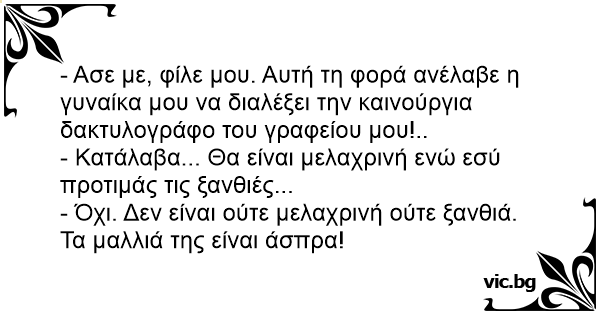 - Ασε με, φίλε μου. Αυτή τη φορά ανέλαβε η γυναίκα μου να διαλέξει την καινούργια δακτυλογράφο του γραφείου μου!..