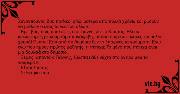 - Βρε, βρε, πως πρόκοψες έτσι Γιάννη; λεει ο Κώστας. Βλέπω κυκλοφορείς με κουρσάρα πανάκριβη, με δυο σωματοφύλακες και ρολόι χρυσό! Πωπω! Εσύ από ότι θυμάμαι δεν τα έπαιρνες τα γράμματα. Ενώ εγώ που ήμουν πρώτος μαθητής, τι πέτυχα; Το μόνο που πέτυχα είναι μια δουλειά στο δημόσιο.