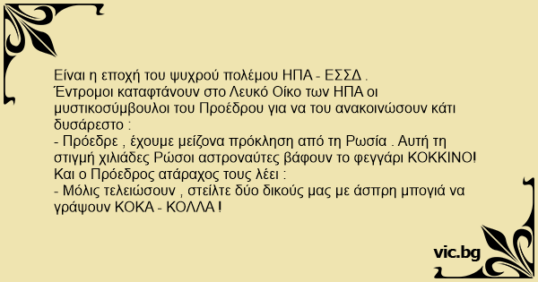 - Πρόεδρε , έχουμε μείζονα πρόκληση από τη Ρωσία . Αυτή τη στιγμή χιλιάδες Ρώσοι αστροναύτες βάφουν το φεγγάρι ΚΟΚΚΙΝΟ!
