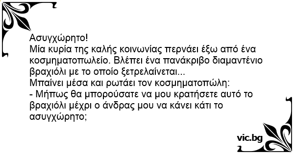 Μία κυρία της καλής κοινωνίας περνάει έξω από ένα κοσμηματοπωλείο. Βλέπει ένα πανάκριβο διαμαντένιο βραχιόλι με το οποίο ξετρελαίνεται...