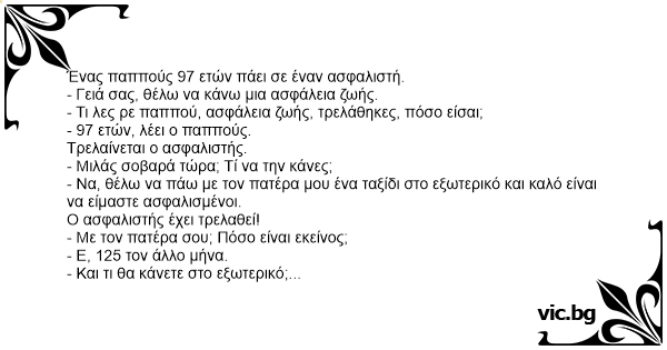 - Τι λες ρε παππού, ασφάλεια ζωής, τρελάθηκες, πόσο είσαι;