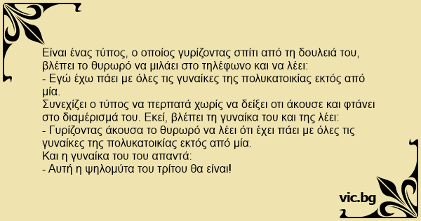 Είναι ένας τύπος, ο οποίος γυρίζοντας σπίτι από τη δουλειά του, βλέπει το θυρωρό να μιλάει στο τηλέφωνο και να λέει: