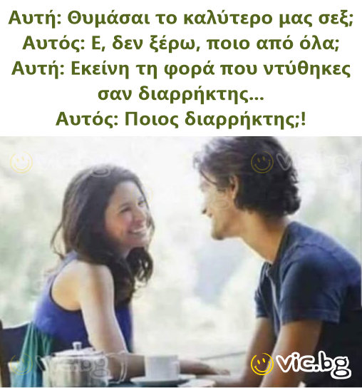 Viņa: Atceries mūsu labāko seksu? Viņš: Nu nezinu, kuru? Viņa: To reizi, kad tu biji pārģērbies par zagli... Viņš: Kādu zagli?!
