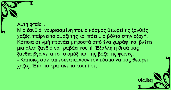 Μια ξανθιά, νευριασμένη που ο κόσμος θεωρεί τις ξανθιές χαζές, παίρνει το αμάξι της και πάει μια βόλτα στην εξοχή. Κάποια στιγμή περνάει μπροστά από ένα χωράφι και βλέπει μια άλλη ξανθιά να τραβάει κουπί. Έξαλλη η δικιά μας ξανθιά βγαίνει από το αμάξι και της βάζει τις φωνές: