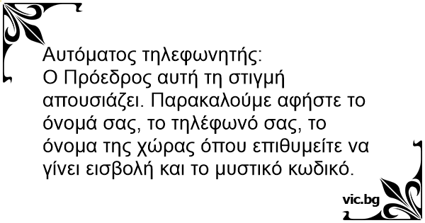 Αυτόματος τηλεφωνητής:<br />Ο Πρόεδρος αυτή τη στιγμή απουσιάζει. Παρακαλούμε αφήστε το όνομά σας, το τηλέφωνό σας, το όνομα της χώρας όπου επιθυμείτε να γίνει εισβολή και το μυστικό κωδικό.