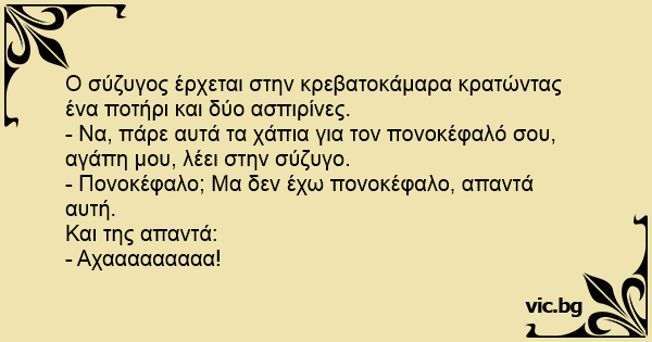 - Να, πάρε αυτά τα χάπια για τον πονοκέφαλό σου, αγάπη μου, λέει στην σύζυγο.