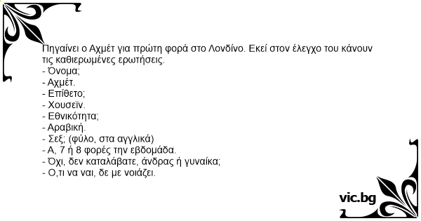 - NAME? - Muhjmatil Ahmed. - SEX? - Three times a week! - NO, I MEAN; MALE OR FEMALE? - Doesnt matter. Sometimes even with camel...