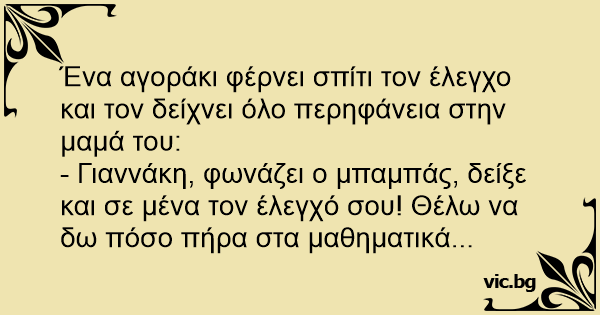 - Γιαννάκη, φωνάζει ο μπαμπάς, δείξε και σε μένα τον έλεγχό σου! Θέλω να δω πόσο πήρα στα μαθηματικά...