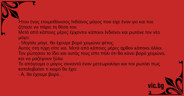 Το απόγευμα ο μάγος συναντά έναν μετεωρολόγο και τον ρωτάει πως καταλαβαίνει τι καιρό θα έχει: