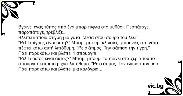 "Ρε! Τι τίγρης είναι αυτή?" Μπαμ, μπουμ, κλωσιές, μπουνιές στη γάτα, πέφτει κάτω αυτή λιπόθυμη. "Ρε ο άτιμος. Την σάπισα την τίγρη."