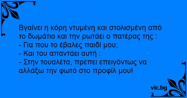 Βγαίνει η κόρη ντυμένη και στολισμένη από το δωμάτιο και την ρωτάει ο πατέρας της :