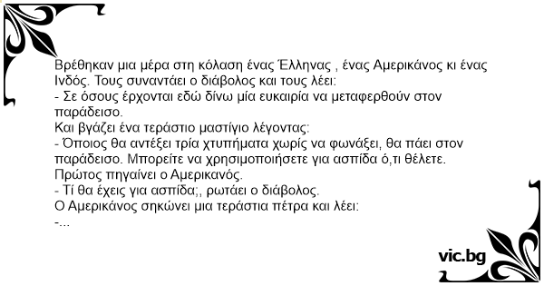 Βρέθηκαν μια μέρα στη κόλαση ένας Έλληνας , ένας Αμερικάνος κι ένας Ινδός. Τους συναντάει ο διάβολος και τους λέει: