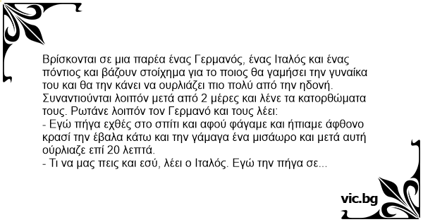 Βρίσκονται σε μια παρέα ένας Γερμανός, ένας Ιταλός και ένας πόντιος και βάζουν στοίχημα για το ποιος θα γαμήσει την γυναίκα του και θα την κάνει να ουρλιάζει πιο πολύ από την ηδονή.