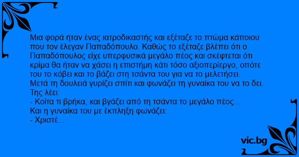 Μια φορά ήταν ένας ιατροδικαστής και εξέταζε το πτώμα κάποιου που τον έλεγαν Παπαδόπουλο. Καθώς το εξέταζε βλέπει ότι ο Παπαδόπουλος είχε υπερφυσικά μεγάλο πέος και σκέφτεται ότι κρίμα θα ήταν να χάσει η επιστήμη κάτι τόσο αξιοπερίεργο, οπότε του το κόβει και το βάζει στη τσάντα του για να το μελετήσει.