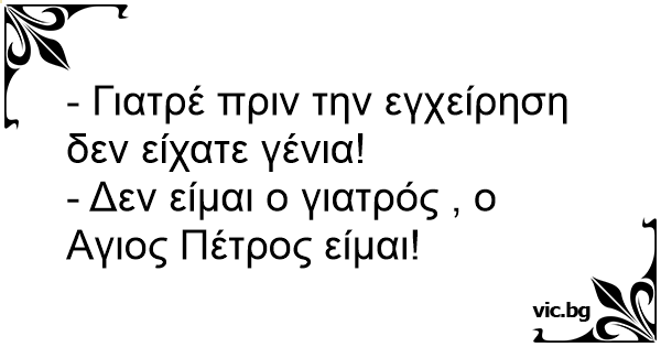 Операција… Τελικά πέτυχε; Ο ασθενής ο γιατρός Πέτυχε η εγχείρηση Στον άλλο κόσμο Πριν και μετά την εγχείρηση Παρα λίγο... - Докторе, како поминав на операција? - Докторе, как мина операцията??? - Доктор, ну как прошла операция? - Doctor, doctor, ¿qué tal ha salido la operación? - ¡Pero qué doctor ni que ocho cuartos! ¡Mire Ud. yo soy San Pedro! C'est un patient qui doit subir une intervention chirurgicale très lourde genre quadruple pontage coronarien et il est mort de trouille. Son chirurgien qui s'en aperçoit décide de le rassurer avant que l'anesthésiste l'endorme. - Ne vous en faites... Após a cirurgia: — Doutor, entendo que vocês médicos se vistam de branco. Mas por que essa luz tão forte? — Meu filho, eu sou São Pedro. Una señorita despierta después de una operación, y ve a un señor a su lado derecho y le pregunta: Señor médico, por lo visto todo salió muy bien en la operación. Y el médico le responde: A ver,... - Докторе, кажи ми всичко, ама без заобикалки. - Аз съм Свети Петър A un doctor, se le murió un paciente. El paciente despierta y dice: ¡Gracias doctor por salvarme! ¡Siento que he vuelto a nacer! Entonces el sujeto le responde: De nada, pero yo no soy el doctor,... Virtasen vaari joutuu melkoisen suureen leikkaukseen, ja komplikaatioita pelätään. Leikkauksen jälkeen Virtanen alkaa heräillä. Leikkaussalin valo häikäisee hänen silmiään, mutta olo on muuten... Pasienten våknet etter operasjonen på sykehuset og sperret øynene opp: – Takk og pris. Operasjonen De foretok, var altså vellykket, doktor? – Doktor? Jeg er ingen lege. Mitt navn er St.Peter. Disculpe, doctor, ¿todo salió bien? Lo ignoro, yo soy San Pedro. Ocara estava morrendo de medo da cirurgia que tinha de fazer. Mas a equipe médica o tranquilizou dizendo que ele seria operado por um grande especialista. Depois de muita choradeira, o cara... Pacientul isi recapata cunostinta dupa operatie: - Domnule doctor, deci operatia a reusit? - Nu, fiule, eu sint Sfintul Petru. Een patiënt is vreselijk bang voor de operatie. De chirurg stelt hem echter gerust: hij zal er helemaal niets van merken. De patiënt krijgt een spuitje en als hij wakker wordt, is alles voorbij.... - Sveiki gydytojau. Ar mano operacija buvo sėkminga? - Atleisk, bičiuli, aš ne gydytojas, aš – šventas Petras. - Doktor úr, olyan sokáig tartott a műtétem, hogy magának közben szakálla nőtt? - Nem fiam, én nem a sebész, hanem Szent Péter vagyok! Budi se čovek i pita prvog koga je ugledao: - Reci te mi , je li gotova operacija? - Čoveče, ja sam Sveti Petar!