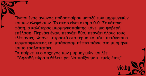 Γίνεται ένας αγώνας ποδοσφαίρου μεταξύ των μηρμυγκιών και των ελεφάντων. Το σκορ είναι ακόμα 0-0. Σε κάποια φάση, ο καλύτερος μυρμηγκοπαίκτης κάνει μια φοβερή επέλαση. Περνάει έναν, περνάει δύο, περνάει όλους τους ελέφαντες. Φτάνει μπροστά στο τέρμα και τότε πετάγεται ο τερματοφύλακας και μπάααααμ πέφτει πάνω στο μυρμήγκι και το τσαλαπατάει.
