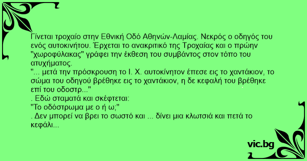 "... μετά την πρόσκρουση το Ι. Χ. αυτοκίνητον έπεσε εις το χαντάκιον, το σώμα του οδηγού βρέθηκε εις το χαντάκιον, η δε κεφαλή του βρέθηκε επί του οδοστρ..."