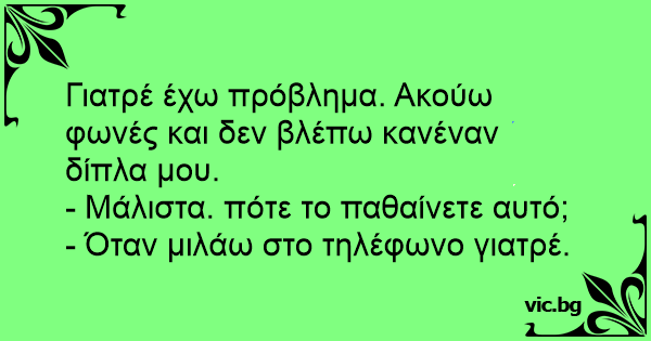 Πόντιος Γιατρέ μου δεν είμαι καθόλου καλά. Ακούω φωνές αλλά δεν βλέπω κανέναν. Γιατρός Μάλιστα. Και πότε σας συμβαίνει αυτό; Πόντιος Κάθε φορά που μιλάω στο τηλέφωνο!