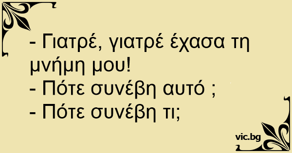 - Γιατρέ, γιατρέ έχασα τη μνήμη μου!<br />- Πότε συνέβη αυτό ;<br />- Πότε συνέβη τι;