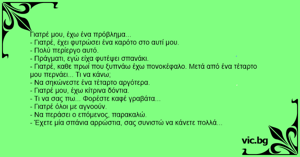 - Γιατρέ, έχει φυτρώσει ένα καρότο στο αυτί μου.