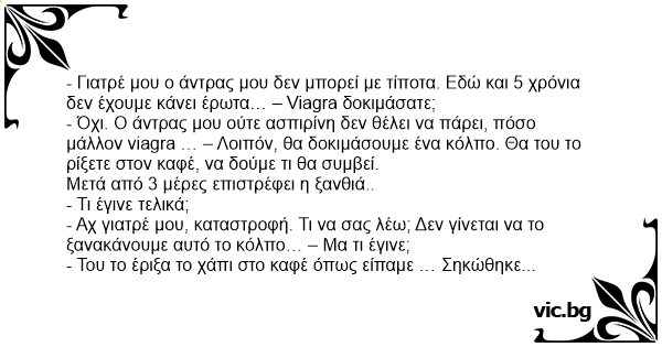- Όχι. Ο άντρας μου ούτε ασπιρίνη δεν θέλει να πάρει, πόσο μάλλον viаgrа … – Λοιπόν, θα δοκιμάσουμε ένα κόλπο. Θα του το ρίξετε στον καφέ, να δούμε τι θα συμβεί.