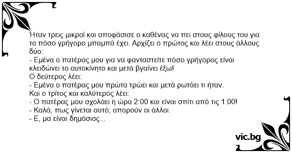 Ήταν τρεις μικροί και αποφάσισε ο καθένας να πει στους φίλους του για το πόσο γρήγορο μπαμπά έχει. Αρχίζει ο πρώτος και λέει στους άλλους δύο: